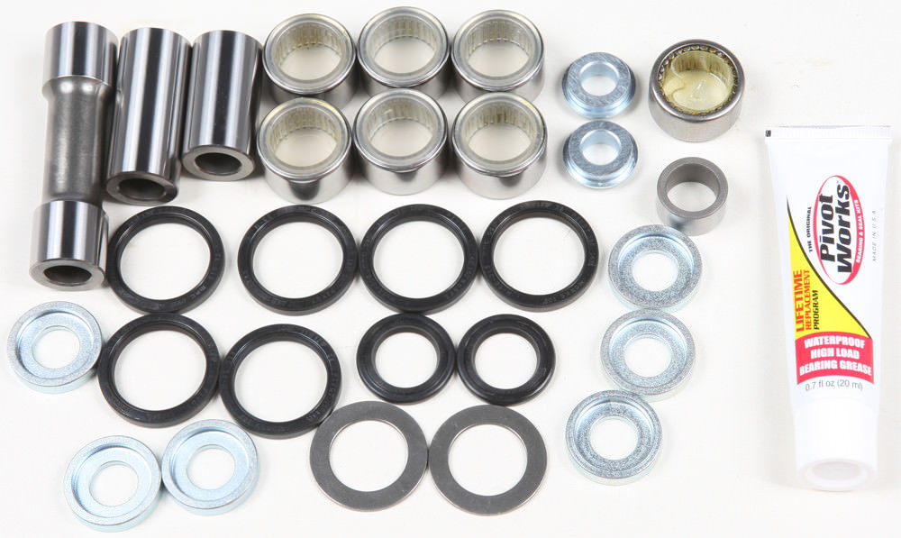 Pivot Works ist eine schnelle, einfache und umfassende Lösung für die Wartung von Lagern und Fahrwerken für Dirt-Bikes und ATVs. Jedes Kit von Pivot Works enthält alle erforderlichen Komponenten (Lager, Dichtungen, Stifte, Distanzringe, Spannringe, Anlaufscheiben und Axiallager), die zum Wiederaufbau jedes Teils des Aufhängungssystems und des Chassis erforderlich sind.